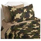 A great all-over camouflage printed bed in the traditional brown camouflage color way.Other accessories include window drapes and valance in same camouflage print as well as a decorative rug with center motif of a jet plane.Interactive, plush, decorative pillows in 3-D shapes with sound are the perfect addition to this bedding ensemble.Decorative pillows include an ATV jeep, tank, and jet.Bed Set includes comforter, standard sham (s), bedskirt, and 200 thread count cotton/polyester blend sheet set.Bedding: Machine Wash in warm, delicate cycle. Do not bleach. Tumble dry low. Warm iron if needed. Use large capacity commercial washer and dryer.Sheets: Machine wash warm. Do not bleach.Tumble Dry Low. Warm iron as needed